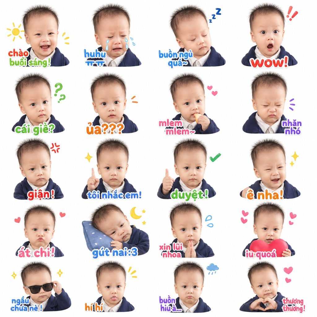 Prompt: “Hãy tạo hình ảnh phong cách sticker zalo sử dụng 100% khuôn mặt em bé trong ảnh upload. Nền sạch, đơn giản. Tổng cộng 16 biểu cảm đa dạng: cười, khóc, buồn ngủ, ngạc nhiên, ngơ ngác, đang ăn, nhăn nhó, biểu cảm đáng yêu… Mỗi biểu cảm thêm chữ tiếng Việt dễ thương, ví dụ: chào buổi sáng!, cái giề?, Ai chịu nẩu!, buồn ngủ quá~, huhu ㅠㅠ, wow!, duyệt!, ê nha!, át chì!, mlem mlem~, giận !, ủa??? , gút nai:3, xin lũi nhoa , iu quoá, ngầu chưa nè !”